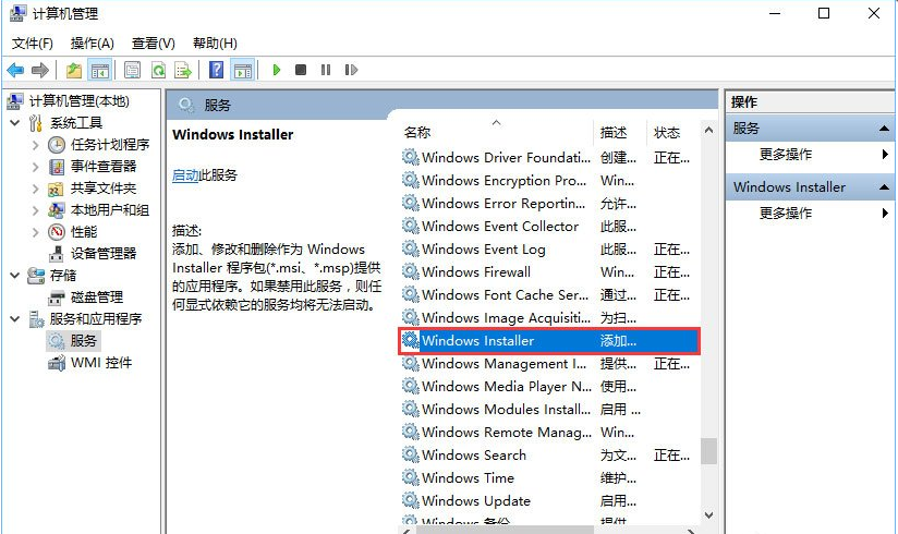 2、在计算机管理中选择使用“服务和应用程序”中的“服务”项,在界面中间的“服务”程序中找到“Windows Installer”项,右键呼出菜单,选择“属性”,点击禁用;