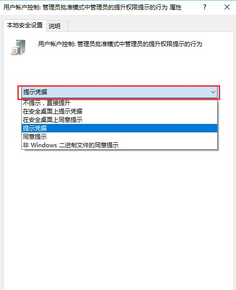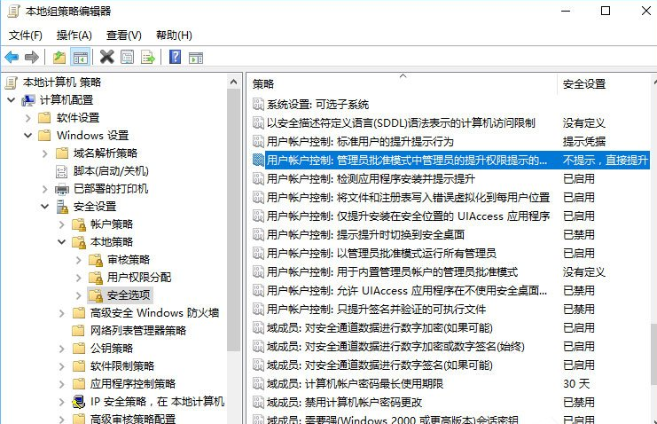 2、计算机配置-》Windows设置-》安全设置-》本地策略-》安全选项-》用户帐户控制:管理审批模式下管理员的提升提示行为-》修改成“提示凭据”;