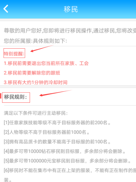 4、移民之前,我们先详细了解一下移民的规则,“特别提醒”、“移民规则”、“其他说明”都要了解清楚,然后按照规则做好准备以后,再回到移民这个页面,然后点击“下一步”。