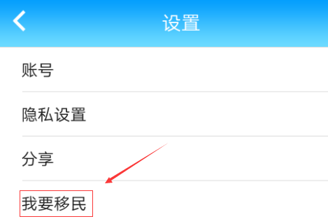 3、进入设置页面以后,我们就可以看到“我要移民”了,我们点击我要移民。