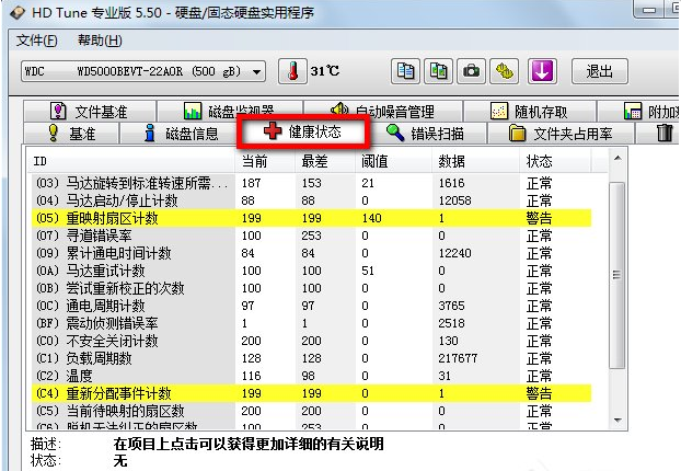 4、点击HDTune硬盘检测工具的健康状态,我们可以看到硬盘的各项使用情况,存在哪些问题等,值得一提的是其中有累计通电时间计数,这个再买电脑时很有用,是不是新电脑新硬盘一看便知。
