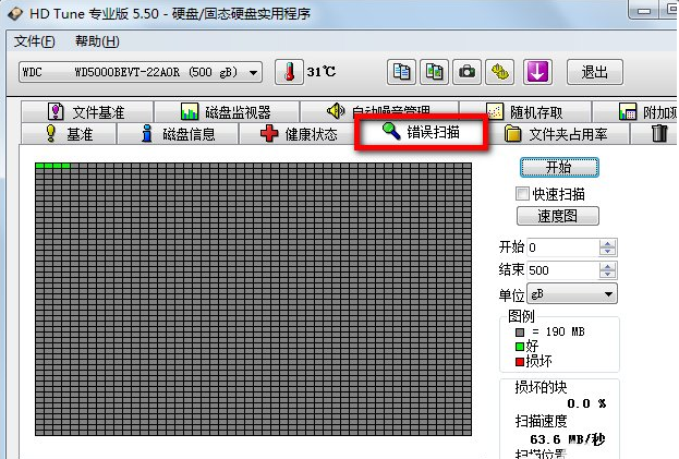 5、点击HDTune硬盘检测工具中的错误扫描,我们来看一下硬盘中是否存在损坏的块。