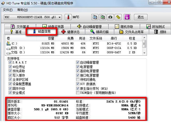 3、在HDTune硬盘检测工具的磁盘信息中我们可以看到自己硬盘的固件版本、序列号、容量以及转速等等,买电脑时可以用来测试,免得被导购骗。