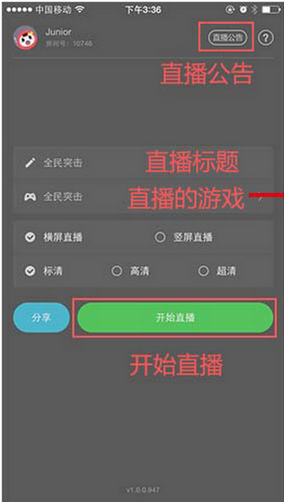 第三步:在小编红色标注的地方填写直播信息:填写直播名称、选择直播的游戏、选择横竖屏直播(需要注意的地方:如果直播的游戏是横屏请选择横屏直播哦!)选择直播源清晰度。