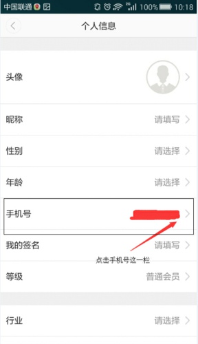 第三步:进入个人信息界面,点击手机号这一栏有灰色箭头的地方,如下图: