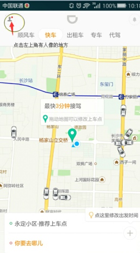 第一步:滴滴用户打开滴滴出行APP,进入界面后点击有【人像】的地方。如下图: