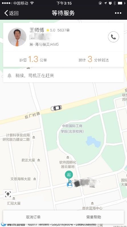 在车票被使用时,乘车人看到的叫车页面和使用滴滴出行App叫车基本一致。重点展示了司机信息、接驾路线、距离多远等信息,清晰明了的页面设计增强了乘车人的使用安心感。