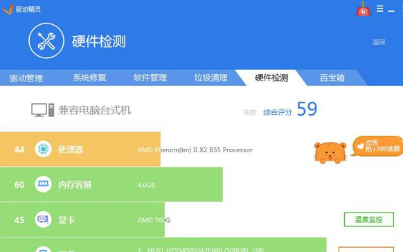 8、硬件检测功能则是检测我们的电脑硬件是否正常,是否出现一些损坏,并给出一定的评分。