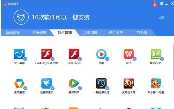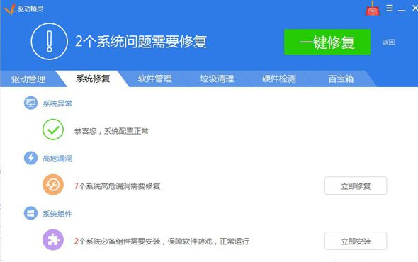 3、检测完成后有六个功能,分别是:驱动管理、系统修复、软件管理、垃圾清理、硬件检测、百宝箱。用户可以根据自己的需要点击不同的功能进行检测。