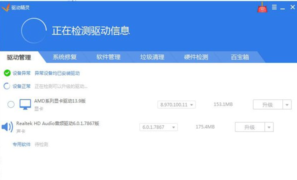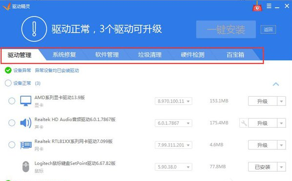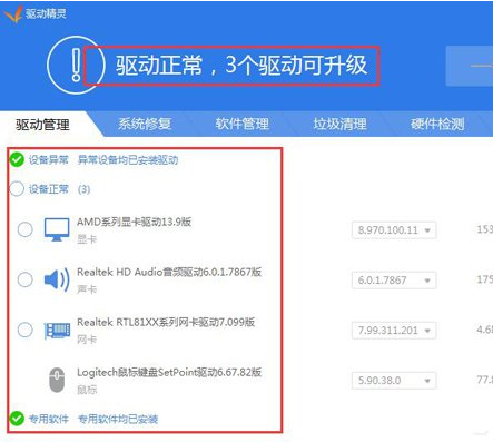 4、驱动管理功能会给我们提示有哪些驱动缺失,有哪些驱动需要升级,我们根据软件的提示来进行操作。