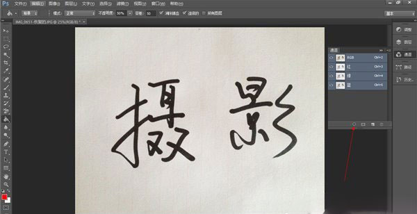 打开照片后,按Ctrl+M调出曲线,还是照上调节使对比分明,不一样的是接下来用通道。曲线调好以后,点击右边的通道,此时看你要抠的字和背景分不分明,不分明还可以继续用曲线调节,直到黑白分明。然后直接点击下面的虚线小圆(将通道作为选区载入):
