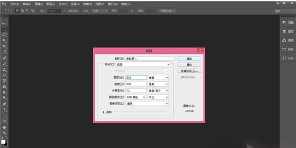 1、打开photoshop,按Ctrl+N新建画布,横竖选择500*300像素即可,没有硬性规定,几百像素的水印用起来更方便,背景内容选“透明”。