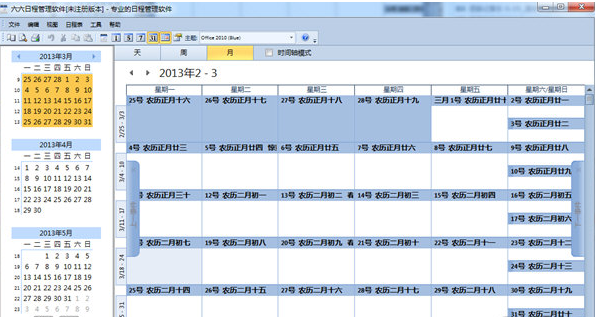 六六日程管理软件是一款专业的日程安排提醒电脑桌面软件,该软件界面简洁、功能实用,包含了编辑、视图、日程表等功能操作。它自带日程提醒功能,可当做电脑闹钟使用,自带农历日历,多种皮肤风格可选择;同时它还带有打印功能,让您的日程安排可以随身携带,多种个性化设置,满足不同人群的使用习惯。