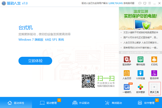 下载安装驱动人生,打开软件,在主界面的右下角你会看到“更多工具”这个选项,点击进入