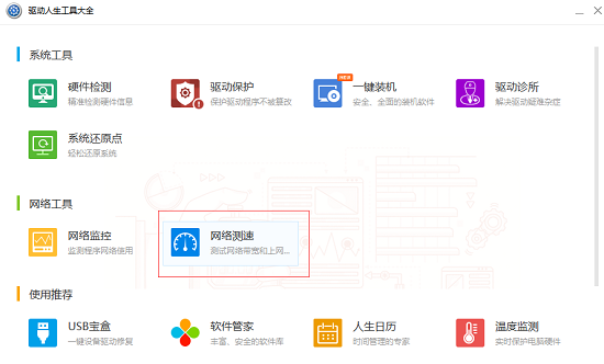 接下来你会进入驱动人生工具大全子窗口,在网络工具中找到“网络测速”,点击即可开始测速。