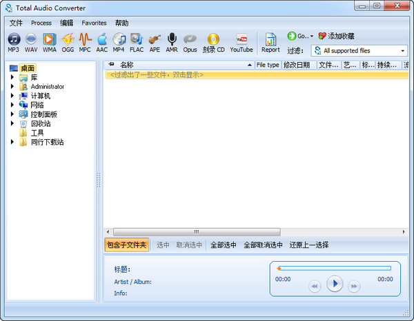 Total Audio Converter是一款万能的音频文件格式转换工具,可简单地将任何音频文件转换成其他的大小和格式而不需要生成临时的wav文件,可转换CD音轨、修改波特率和频率,支持各种流行的音频格式。