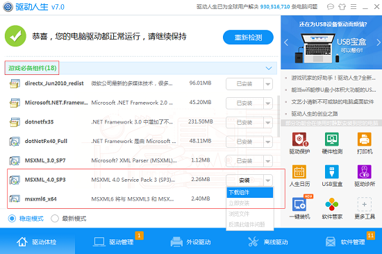 驱动人生是当前一款功能比较实用的、免费的驱动检测安装软件,能够实现智能检测硬件并自动查找安装驱动,方便实用。今天呢,小编给大家介绍下用驱动人生安装游戏组件的方法教程,有需要的小伙伴可以了解下。