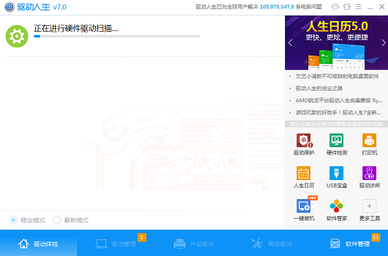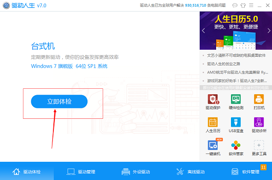 下载安装驱动人生7,打开软件,在首页驱动体检上点击立即体验,驱动人生就会根据本机配置信息检测到需要更新的驱动程序和游戏必备组件。