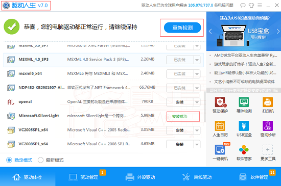 最后,游戏必备组件安装成功后会显示安装成功的字样,如果你还不放心,还可以点击重新检测再检测一遍,确认所有游戏必备组件都安装成功后,你就可以开启冒险之旅了!