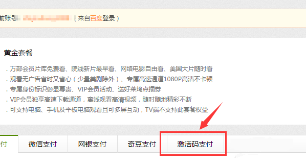 2、这时,会跳到支付界面,这里有很多方式可以获得爱奇艺VIP,我们可以选择“激活码支付”方式。