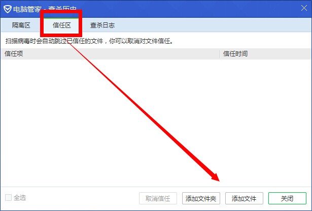 3、进去之后点击添加文件或者添加文件夹将自己信任的文件添加进去,这样杀毒软件在杀毒的时候就会忽略掉这些文件。