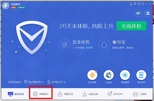 1、打开腾讯电脑管家,后点击下面的【病毒查杀】一项。
