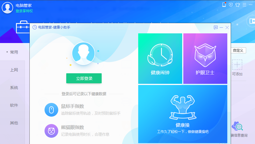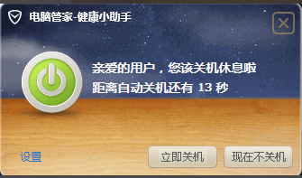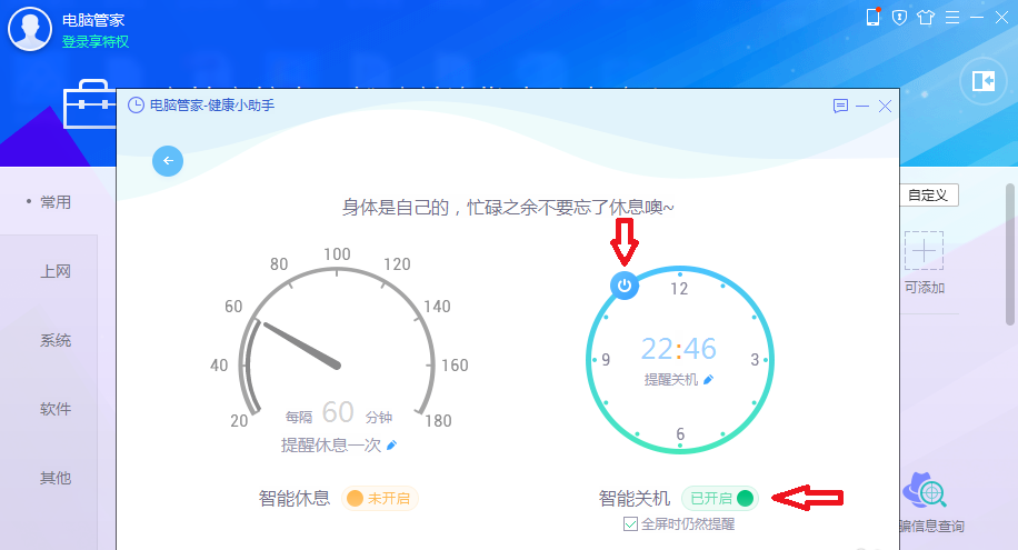3、定时关机在健康闹钟里,鼠标指向健康闹钟,会出现定时休息和定时关机功能,点击详情进行设置
