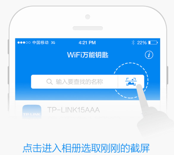 第三步、点击如下图所示“红框”区域,进入相册当中,选中刚刚截屏的图片,然后Wifi万能钥匙 iPhone 版就会开始解析你截图所示Wifi热点,分析完毕之后就会有一个可以链接的界面出现。