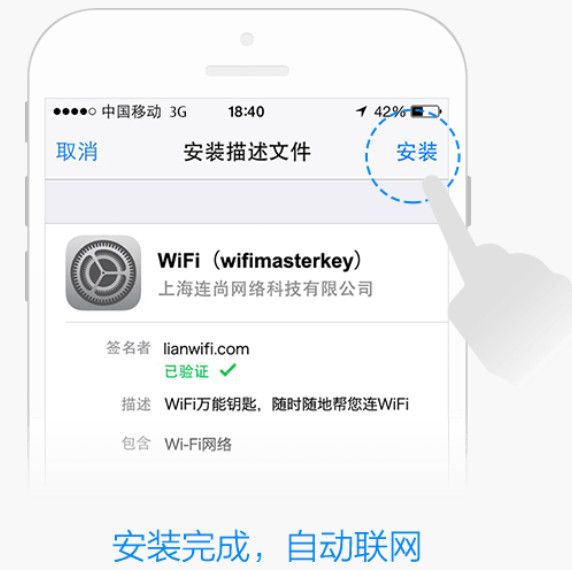 第五步、Wifi万能钥匙iPhone版会提示你需要安装一个描述文件,这个文件是关于你需要链接的Wii风热点的描述文本信息,根据提示,确认安装即可,在这个过程当中因为需要在本地安装文件,需要你输入手机锁屏密码。