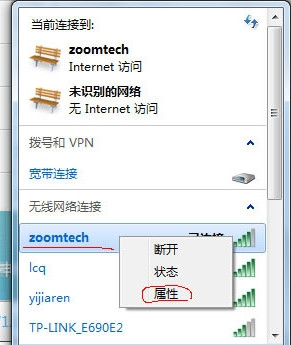 第一步:我们点击软件的右下角,有个“信号”的图标,然后选择你当前的网络,然后单击右键,点击“属性”
