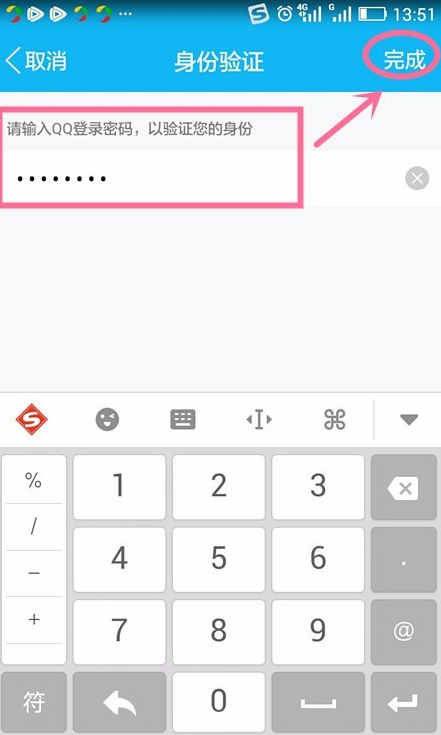 6、点击“创建手势密码”,首先需要通过QQ登录密码来验证身份,输入QQ登录密码,点击右上角“确认”。