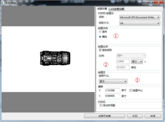 4、切换回“绘图设置”选项卡,在这里设置“绘图方向”、“绘图比例”等,设置完成后,可以在界面左侧预览文打印效果。设置完成后就可以点击“打印”按钮,开始CAD打印了。