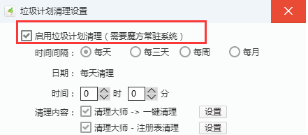 3、在“定时清理垃圾”界面勾选上“启用垃圾计划清理”,接着再设置一下清理的时间、频率、清理内容等,设置完毕后点击“确定”就可以了;