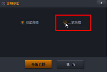 3、 在弹出的面板中选择“正式直播”(如果你只是想自己测试直播效果,不想让别人看到,则请选择“测试直播”)