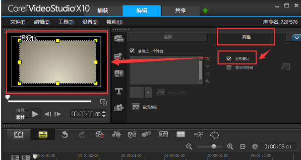 2、添加好后双击视频素材,接着在右上方的“属性”栏中勾选上“变形素材”,之后在左边的“预览框”中调整素材大小使得整个黑边到移动到窗口之外即可。