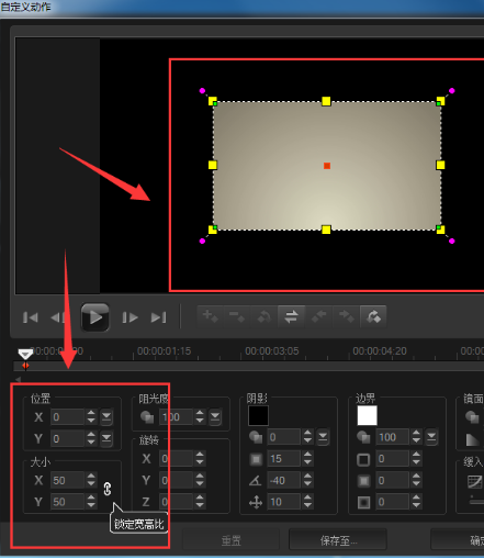 2、在“自定义动作”界面我们可以直接拖动视频素材的边框来调整其大小,或者也可以在下方的“位置”中调整“X、Y”轴直到黑边在预览界面之外就可以了;