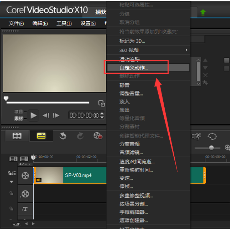 1、依旧是现在“视频轨”中添加好素材,然后用鼠标右键点击视频素材,在弹出的选项中点击“自定义动作”;