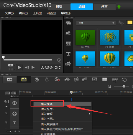 1、首先我们打开会声会影,然后在下边的“视频轨”中添加好想要去除黑边的视频文件(鼠标右键点击“视频轨”,然后在弹出的选项中点击“插入视频”即可);