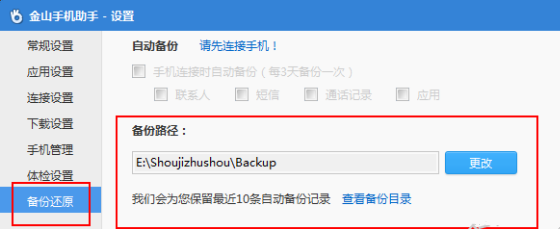 3、备份的文件会保存在电脑中,在“设置”界面的左侧打开“备份还原”,在这里就可以看到金山手机助手备份文件保存的位置了;