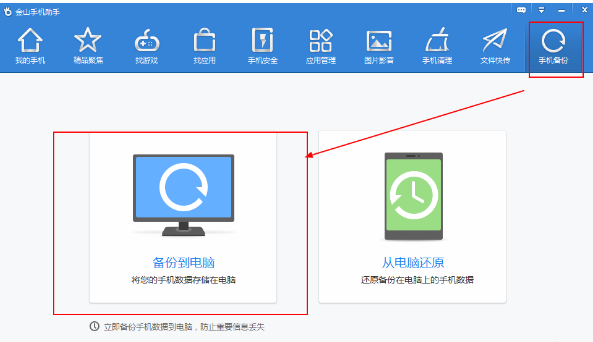 1、首先要将手机和电脑中的金山手机助手进行连接,连接成功后在金山手机助手的“手机备份”中打开“备份到电脑”功能,如下图所示: