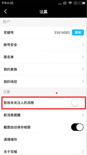 2、在设置页面,点“拒收未请关注人的消息”后的按钮即可。