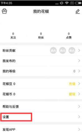 1、打开花椒直播,点右下角的我,进入“我的花椒”,可以看到“设置”,如下图;