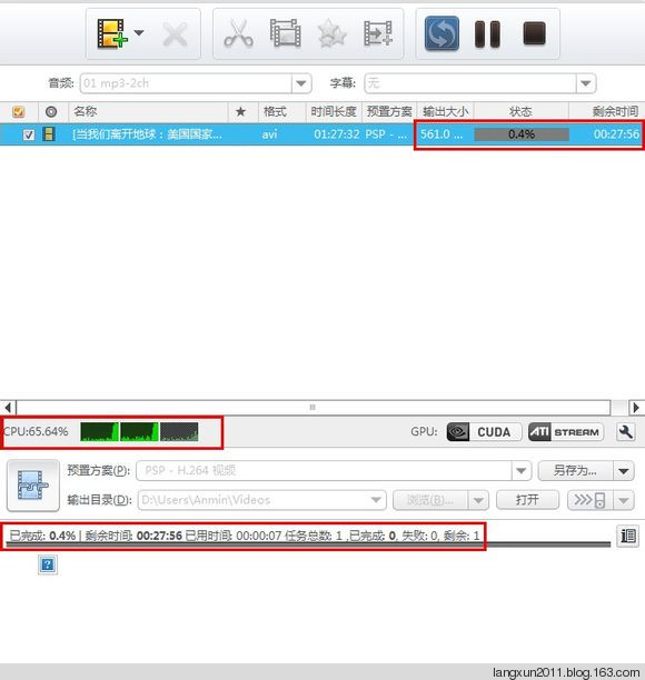 点击转换按钮,软件便开始了对视频文件的转换。在转换的过程中,你可以看到CPU的实时情况,还可以看到任务的结束时间等等的信息。你也可以选择关掉或开启CPU线程,但是必须留下一个线程用于转换。