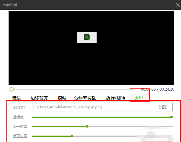 3、之后在“画面处理”的“水印”功能中就可以给视频添加水印了,点击“浏览”将准备好的图片水印添加进来,接着调整水印的“透明度”、“水平位置”以及“垂直位置”,调整完毕后点击“确定”;