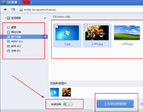 2、在QQ影像中找到想要上传的照片并选中它,开启“快速选择”后可以同时选中多张照片,如下图所示: