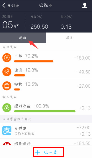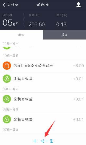 2、点击进入“记账本”功能,在页面可以看到“报表”、“明细”,我们点击方可看见日常开支明细了,点击下方“记一笔”;