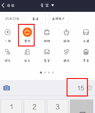 3、选择分类、填写金额,点击支出。(在这里小编选择餐饮作为示范)