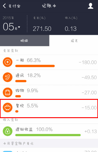 4、然后在支付宝支出列表中我们看可以看到多了一项“餐饮”消费。