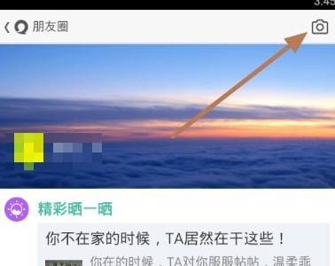 3、发送朋友圈消息也是同微信的位置一样,呵呵,点击右上角的相机图标。