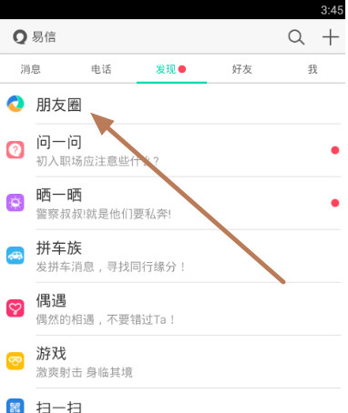 进入易信后,点击“发现”,操作方式跟微信几乎一样的路径,